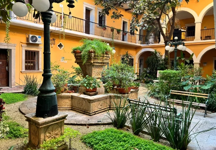 Morgenmaden serveres i den charmerende gårdhave, og i de omkringliggende gader finder du et væld af spisesteder, hvor du har mulighed for at prøve forskellige traditionelle mexicanske retter.