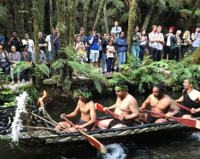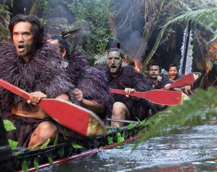 Du ser blandt andet krigere padle ned ad Wai-o-Whiro-floden i en traditionel krigerkano (waka).