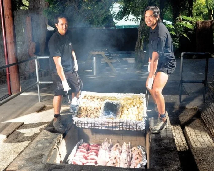 Den storslåede forestilling efterfølges af en traditionel hangi-middag med mørt kød og grøntsager, tilberedt i en jordovn (hāngi) med varme sten. Den langsomme dampning giver maden (kai) en karakteristisk, lækker røget smag. Middagen serveres som buffet, og der spises ved fælles langborde.