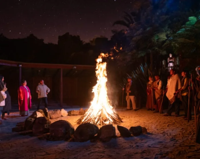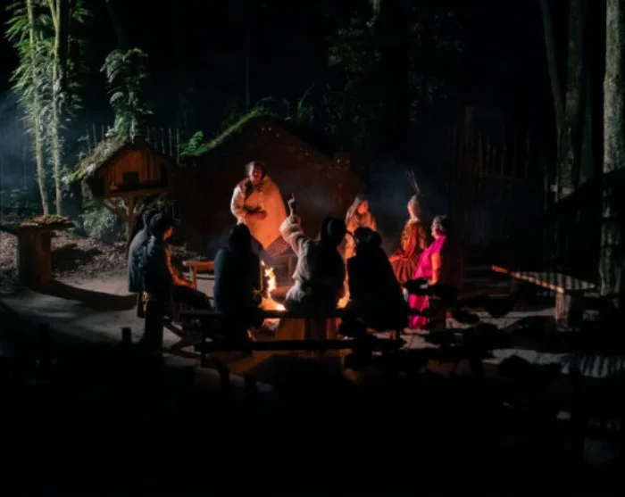 I et naturligt amfiteater, omgivet af tårnhøje tawa-træer og flammende bål, oplever du en medrivende kapa haka-optræden. Gennem haka, poi og waiata (sange) formidles maoriernes historier og traditioner, hvilket skaber en dyb forbindelse til Aotearoas (New Zealands) kulturelle rødder.
