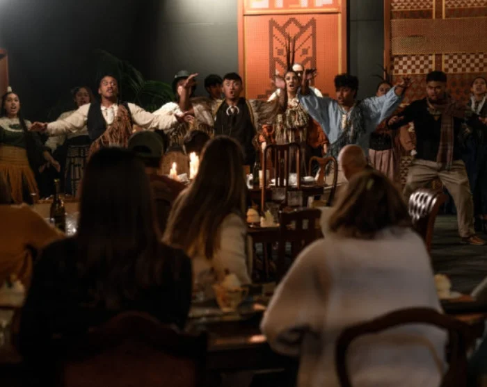 Efter optrædenen guides du gennem skoven til en overdådig treretters maori-fusionsmiddag. Menuen varierer med årstiderne og inkluderer retter tilberedt i en traditionel jordovn (hāngī) samt moderne kreationer med indfødte ingredienser som kawakawa, pikopiko og røgede specialiteter. Maden nydes ved fællesborde, hvilket fremmer fællesskab og samtale.