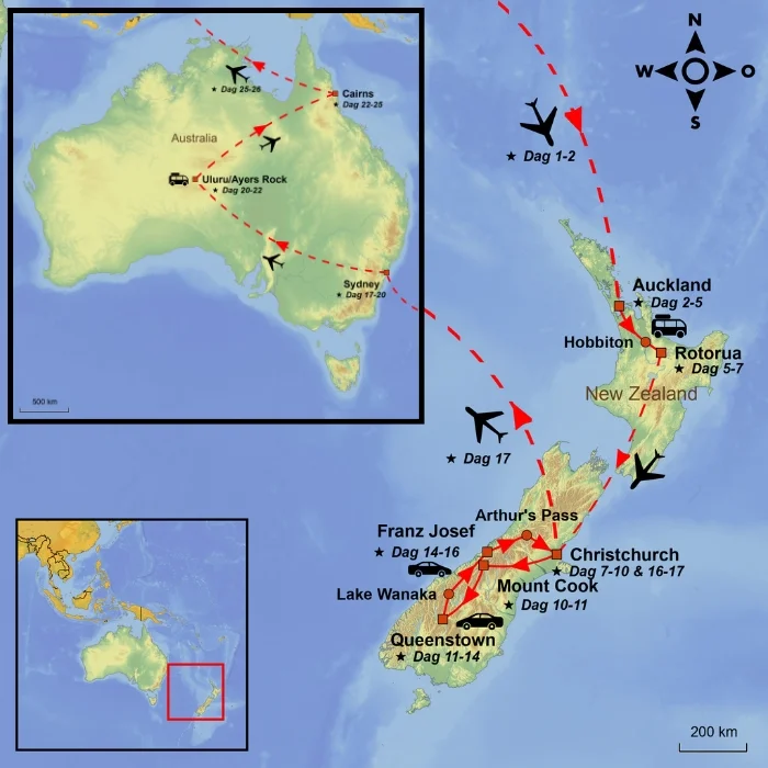 Rejsen begynder i Auckland på New Zealands Nordø, hvor du kan opleve den livlige storby med dens moderne atmosfære, havnefront og smukke udsigtspunkter. Herefter går turen videre til Rotorua, som er kendt for sine boblende gejsere, varme kilder og fascinerende maoritraditioner.