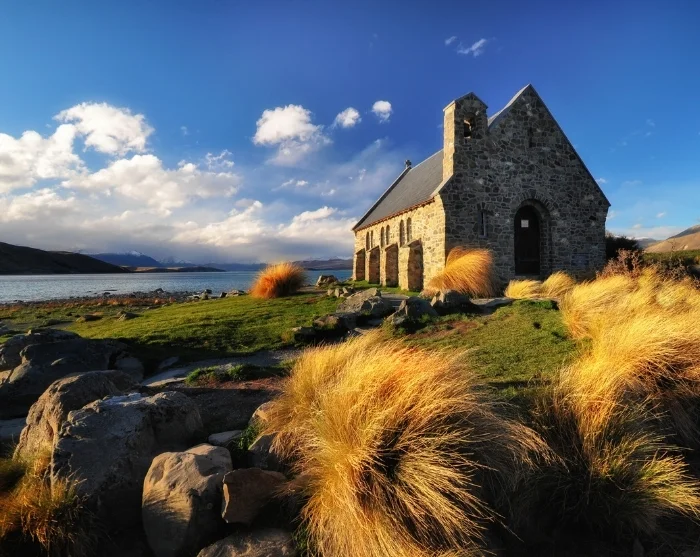 Fra Christchurch kører du gennem de bølgende Canterburysletter og videre mod højlandet og de snedækkede Sydlige Alper. Et oplagt stop er ved Lake Tekapo (Takapō), som er kendt for sit klare, turkisblå vand og det lille stenbyggede kapel The Church of the Good Shepherd.