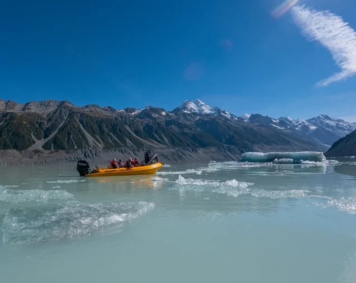 Inden du forlader Mount Cook-området, kan du overveje at tilkøbe en sejltur på Tasman-søen. Her kommer du helt tæt på små isbjerge og Tasman-gletsjeren, som er landets største.
