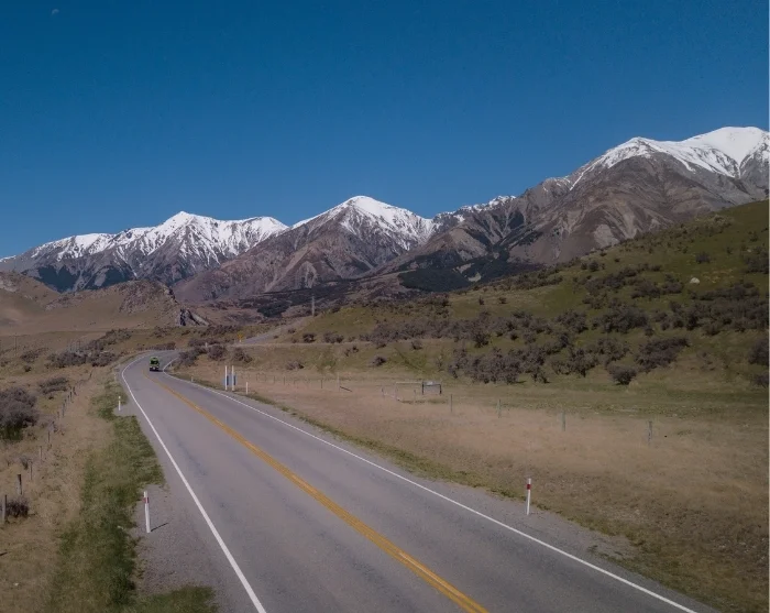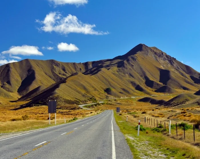 Herfra fortsætter turen gennem det gyldne højland og forbi Omarama, inden vejen snor sig over Lindis Pass, en storslået bjergstrækning med bløde bakker så langt øjet rækker.