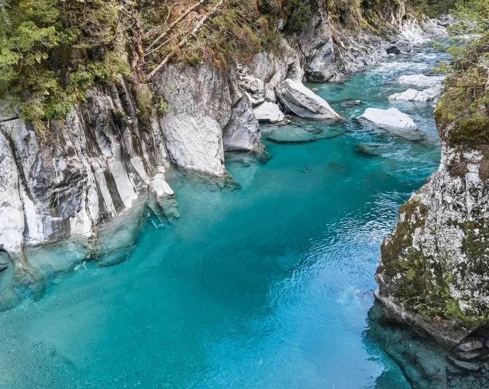 På strækningen gennem Mount Aspiring Nationalpark kan du tage en kort vandretur ad Blue Pools Track, som fører dig gennem bøgeskov til klare, turkisblå pools. Lidt længere fremme kan du gøre et fotostop ved Thunder Creek Falls, et 28 meter højt vandfald omgivet af frodig skov.