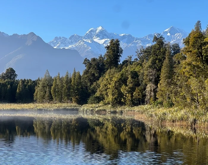Køreturen fortsætter over Haast-passet og ud til vestkysten, hvor landskabet ændrer sig og bliver grønnere og vildere. Før du når Franz Josef, anbefales et stop ved Lake Matheson (Te Ara Kairaumati), som er kendt for de smukke spejlinger af Mount Cook og Mount Tasman i søens overflade. Her finder du også udsigtspunktet Te Kopikopiko o te Waka, hvorfra du kan se Fox-gletsjeren i klart vejr.