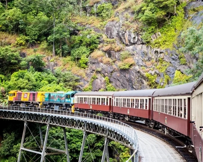 En anden populær udflugt går til den charmerende bjerglandsby Kuranda. Her tager du med den naturskønne Kuranda Scenic Railway op gennem regnskoven og returnerer via Skyrail Rainforest Cableway, der svæver hen over trætoppene og giver en spektakulær udsigt over området. I Kuranda kan du nyde de hyggelige markeder, små caféer og gallerier, inden turen går tilbage mod Cairns.