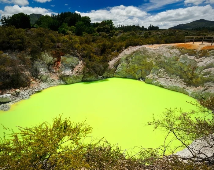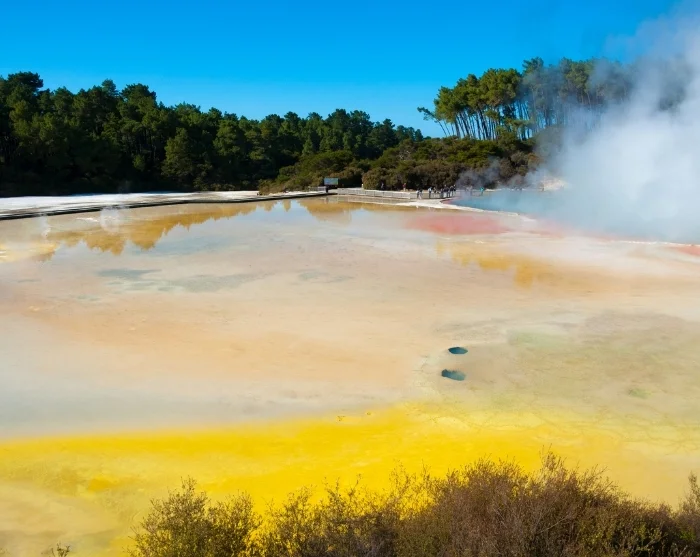 Der er tid til frokost og kaffepauser undervejs (for egen regning), inden turen fortsætter til Wai-O-Tapu. Her har naturens kræfter skabt et farverigt og fascinerende geotermisk landskab med bl.a. Champagne Pool, kratersøer og svovldampe, som stiger op af jorden. Det føles næsten som at være på en anden planet, og den karakteristiske lugt af svovl er en del af oplevelsen.