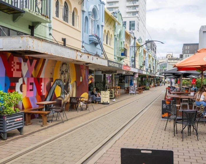 En dejlig måde at afslutte dagen på er med middag langs Avon-floden i området omkring The Terrace og Oxford Terrace. Her finder du et livligt kvarter med moderne restauranter, caféer og barer, hvor mange har udeservering med udsigt til vandet. Tæt ved ligger også Riverside Market, et indbydende madmarked med små spisesteder, specialbutikker og lokale delikatesser.