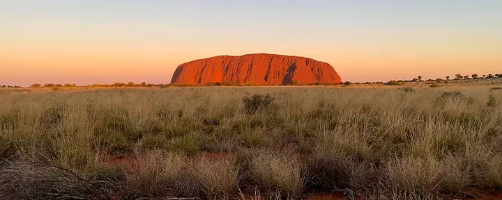 Sidst på dagen venter en solnedgangstur over Uluru. Det er en magisk oplevelse at se, hvordan den enorme klippe langsomt skifter farve fra rustrød til lysende orange, inden den til sidst står som en grå skikkelse i det svindende lys.