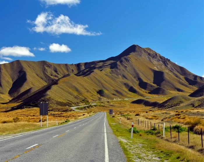 Fra Twizel fortsætter rejsen gennem det åbne og gyldne højland, forbi Omarama og op over Lindis Pass – en storslået bjergstrækning, hvor de bløde bakker strækker sig ud i alle retninger. Herfra åbner landskabet sig mod Central Otago, og du nærmer dig den hyggelige by Cromwell, som ligger midt i et af New Zealands bedste vinområder.