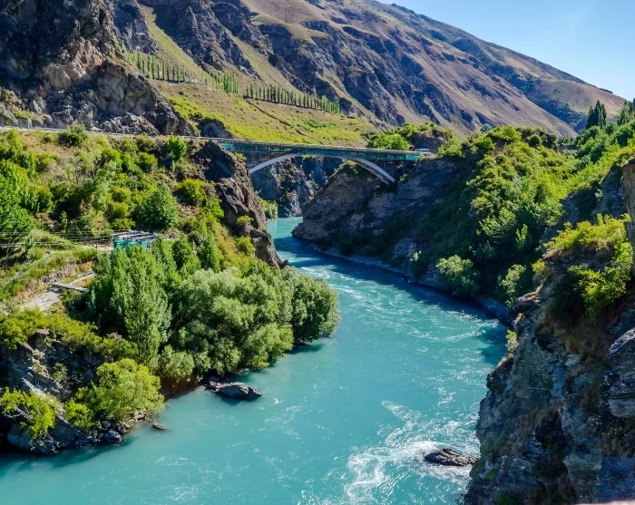 Videre fra vinmarkerne går ruten gennem den dramatiske Kawarau Gorge, hvor vejen snor sig langs floden gennem rå klippeformationer. Undervejs kan du stoppe ved Goldfields Mining Centre og prøve kræfter med guldvask eller kigge forbi Kawarau Bridge, hvor adrenalinsøgende besøgende tager springet ud fra broen i et bungy jump.