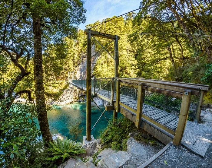 På vej gennem Mount Aspiring Nationalpark kan du overveje en kort vandretur ad Blue Pools Track. Turen er let og fører dig gennem bøgeskove til klare, turkisblå pools, som har fået deres farve fra smeltevand fra gletsjere i området.