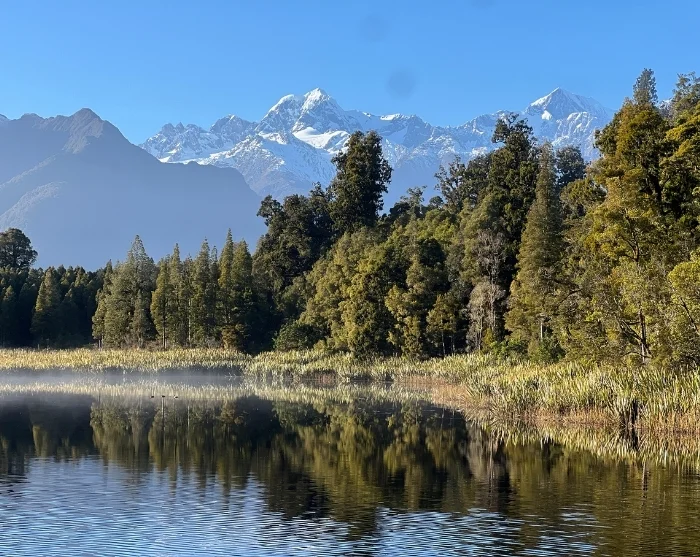 Inden du når Franz Josef, anbefaler vi, at du gør et stop ved Lake Matheson (Te Ara Kairaumati), som er kendt for sine spejlinger af Mount Cook og Mount Tasman i søens blanke overflade. En rundtur omkring søen er 4,4 km og byder på flere flotte udsigtspunkter. Tæt herpå finder du også udkigspunktet Te Kopikopiko o te Waka, hvorfra du i klart vejr kan se Fox-gletsjeren (Te Moeka o Tuawe).