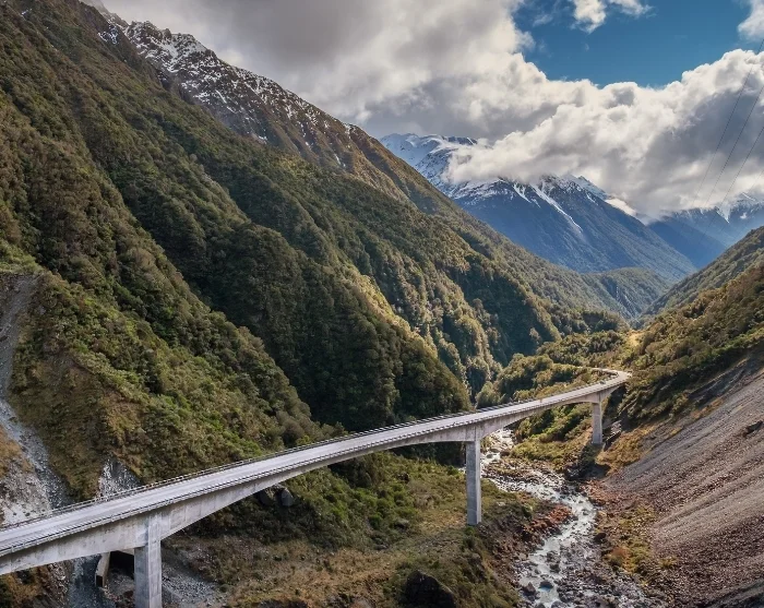 Efter Hokitika fortsætter du mod Kumara Junction, hvor du drejer østpå ad Highway 73 og begynder opstigningen mod Arthur’s Pass Nationalpark. Her ændrer landskabet sig dramatisk: Regnskoven bliver til alpine buske, og bjergene rejser sig omkring dig. På vejen kan du stoppe ved Otira Viaduct Lookout, hvor du har udsigt over den spektakulære viadukt, der snor sig gennem den stejle dal. Hold også udkig efter den frække kea, verdens eneste alpine papegøje, som ofte ses omkring parkeringspladsen.