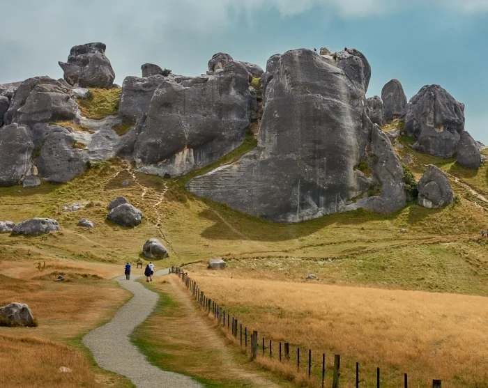 Når du forlader bjergene og fortsætter østpå, åbner landskabet sig op, og snart dukker et af køreturens mest særprægede steder op: Castle Hill (Kura Tāwhiti). De store, grå kalkstensklipper ligger spredt i det åbne græsland og skaber en nærmest magisk stemning. En kort gåtur fører dig ind blandt klipperne, hvor du kan nyde udsigten og tage billeder i det eventyrlige landskab, der har været med i film som Ringenes Herre og Narnia.