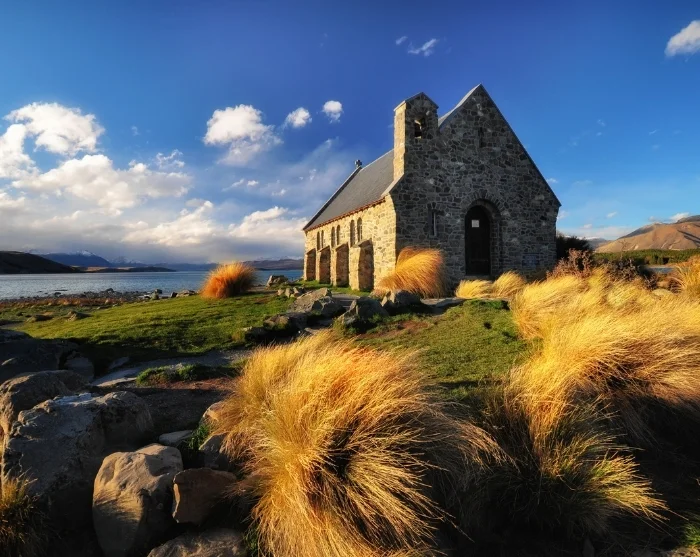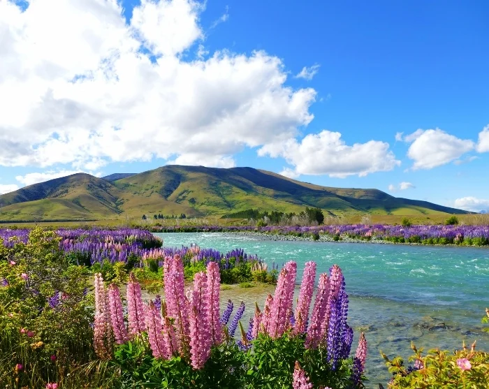Fra Christchurch kører du gennem de bølgende Canterbury-sletter og videre mod det centrale højland og de snedækkede Sydlige Alper. Første stop er ved den ikoniske sø Lake Tekapo (Takapō), som er kendt for sit krystalklare, turkisblå vand og det lille, stenbyggede kapel, Church of the Good Shepherd, som måske er et af de mest fotograferede steder i landet.