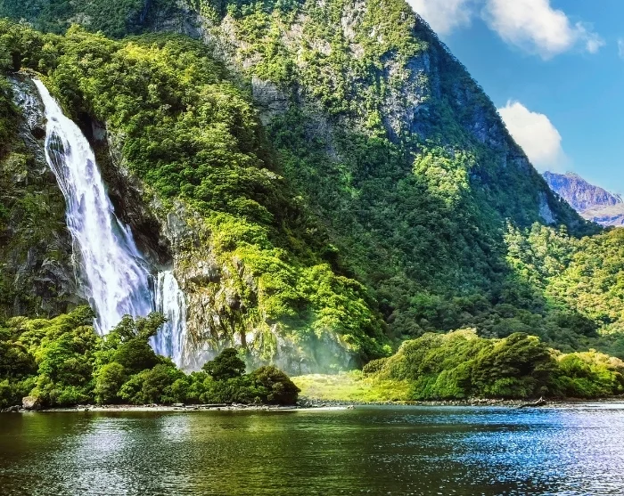 Ved ankomsten til Milford Sound skal du på en ca. 2 timers eventyrlig sejltur på fjorden. Du kommer helt tæt på den storslåede natur med lodrette klippevægge, brusende vandfald, tæt regnskov, og måske du også ser delfiner og newzealandske pelsæler, der ligger og soler sig på klipperne. Der er en passioneret naturguide ombord på båden, der undervejs deler ud af sin brede viden om området.