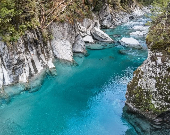 Første stop er ved den spektakulære kløft Hokitika Gorge, der er kendt for sit turkisblå vand, som omgives af tæt, indfødt skov. Her får du mulighed for at tage billeder og nyde den rolige natur.