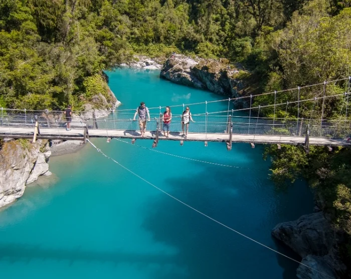 Ca. 1 time fra Wanaka skal du ud at bevæge dig lidt på en forholdsvis nem 3 km lang gåtur kaldet Blue Pools Track, som ligger i Mount Aspiring Nationalpark. Stien fører dig gennem en smuk bøgeskov til de krystalklare, turkisblå pools, hvor de to floder Makarora River og Blue River mødes. Vandets utrolige klarhed og farve skyldes det kolde smeltevand fra gletsjerne i området.