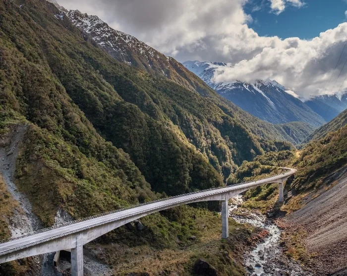 Videre mod øst passerer du Otira Gorge-udsigtspunktet, også kendt som Death’s Corner, hvor du kan beundre den imponerende 440 meter lange Otira Viaduct og måske spotte den legesyge alpine papegøje, kea.