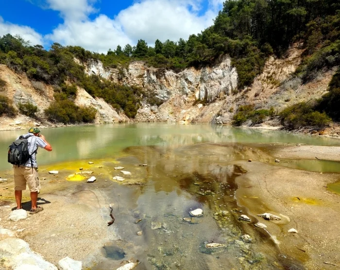 Herfra kører du videre sydpå mod Wai-O-Tapu, som er et farvestrålende og spektakulært geotermisk område, skabt af tusinder af års vulkansk aktivitet. Her venter et surrealistisk landskab fyldt med boblende mudderpøle, dampende jord og varme kilder i alle regnbuens farver. Her kan du bl.a. opleve den næsten uvirkelige Champagne Pool med sit orange kantbånd og boblende overflade, samt farvestrålende kratersøer og dampende stier, der fører dig gennem et landskab, som mest af alt ligner noget fra en anden planet. Og ja – så ”dufter” her af svovl, men det er en del af oplevelsen.