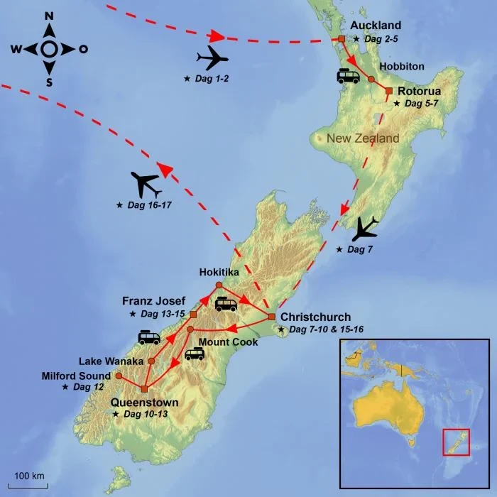 Rejsen begynder i Auckland, landets største by, og fortsætter gennem det magiske Hobbiton til Rotorua, hvor boblende, geotermisk aktivitet og levende maorikultur venter.