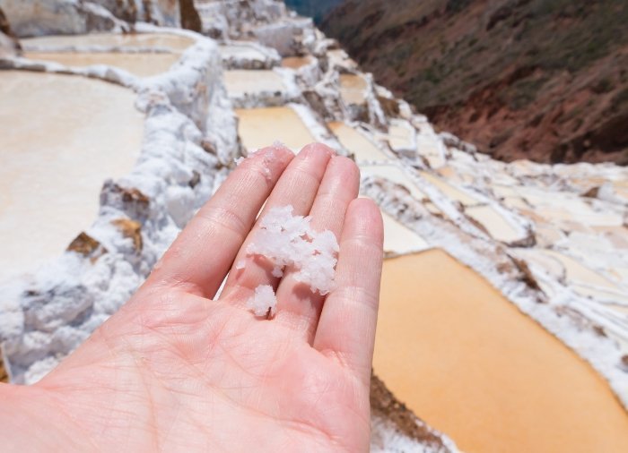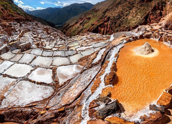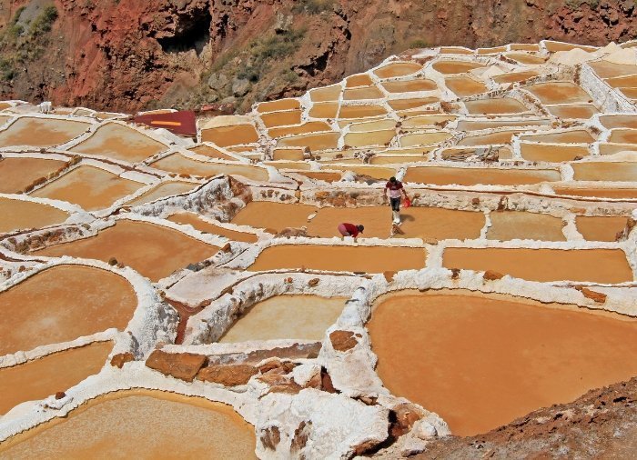 Dette unikke landskab består af over 3000 små bassiner, som er hugget ud i en bjergside og som dagligt fyldes med saltvand fra en nærliggende kilde. Når vandet fordamper, efterlader det et lag af rent salt, som først høstet og derefter sælges af lokalbefolkningen. Saltminerne har været i brug i århundreder og stammer helt tilbage fra før inkatiden. Foruden at være en vigtig kilde til indtægt for de lokale, er det også et imponerende syn at opleve.