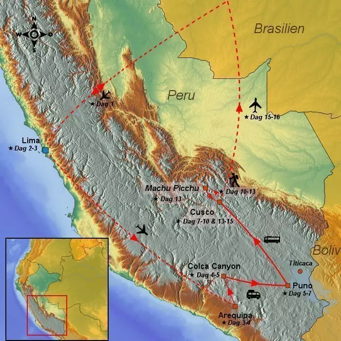 Peru er inkaernes skatkammer og gemmer på nogle af Sydamerikas største kulturelle og naturrige oplevelser. Du kan se frem til landets koloniale perler, spektakulære bjerge og vulkaner samt Colca Canyon og Den Hellige Dal med imponerende terrassesystemer, spændende lokalsamfund og farverige markeder. Det er også her du kan opleve landets unikke dyreliv med lamaer, alpakaer og kondorer. Du kommer tæt på Uros folket ved Titicaca søen og besøger Inkarigets gamle hovedstad Cusco, hvor du bl.a. ser inkaernes imponerende stenhuggerkunst. Herefter starter inkatrekket hvor du følger den berømte Inkasti. Her kan du se frem til at opleve de beundringsværdige ruiner og den fantastiske natur med grønne dale, snedækkede bjergtinder, et væld af planter og et rigt dyreliv samt et af verdens nye vidundere, Machu Picchu som den perfekte afslutning på trekket.