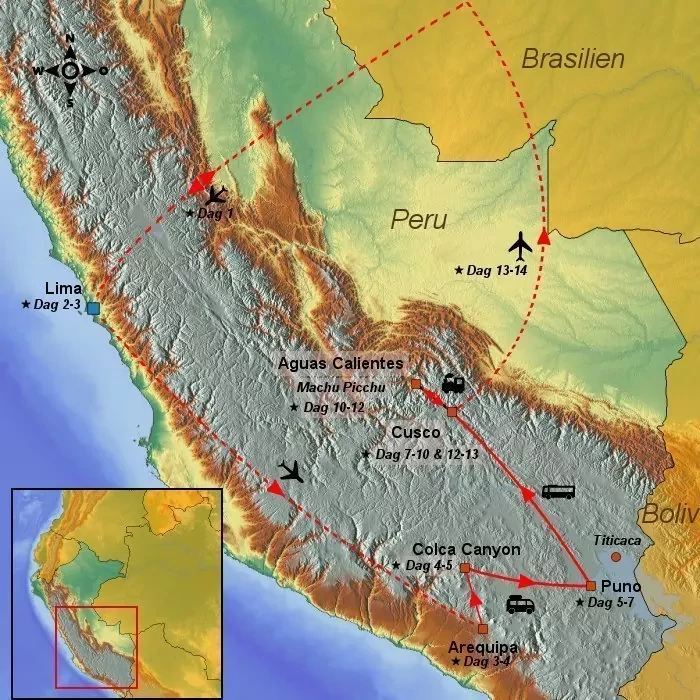 Peru er et slaraffenland for kultur- og naturelskere. På denne rejse besøger du de koloniale perler Lima og Arequipa samt det fantastiske Colca Canyon med gamle landbrugsterrasser og kondorer. Ved Titicaca søen kommer du tæt på lokalbefolkningen, hvor du får indblik i deres levemåde og kultur. Du oplever Inkarigets gamle hovedstad Cusco og Den Hellige Dal med besøg til den åbne museumsby Ollantaytambo, hvor indbyggerne holder fast i gamle traditioner og love. Det er også her du kan opleve alpakaer og lamaer. Peru er kendt for sine charmerende markeder og du besøger derfor markedsbyen Pisac. Inden rejsen slutter, besøger du den lille by Aguas Calientes tæt ved turens absolutte højdepunkt, inkabyen Machu Picchu, med de spektakulære inkaruiner. Fra Machu Picchu og dens omgivelser kan du nyde den betagende udsigt til høje bjerge og tågeskov, inden turen går tilbage til hovedstaden Lima og de danske himmelstrøg.