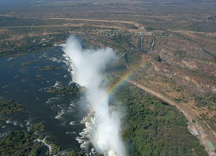 Det kan man til gengæld fra luften! Fra luften får du også et spektakulært syn ud over de mange kløfter, som de enorme mængder vand har dannet gennem tiderne. En lang helikopterflyvetur giver naturligvis flere muligheder for virkelig gode billeder, men selv en kortere tur på 10 minutter byder på fantastisk udsigt og gode muligheder for at få billeder med hjem af vandfaldet i hele dets længde – inkl. et par de regnbuer, som næsten altid spiller i vanddråberne fra de rasende vandmængder. Det er vel ikke uden grund, at Victoria vandfaldene på det lokale sprog hedder Mosi-oa-Tunya – hvilket betyder ”Røgen, der tordner” (”Smoke that thunders”).