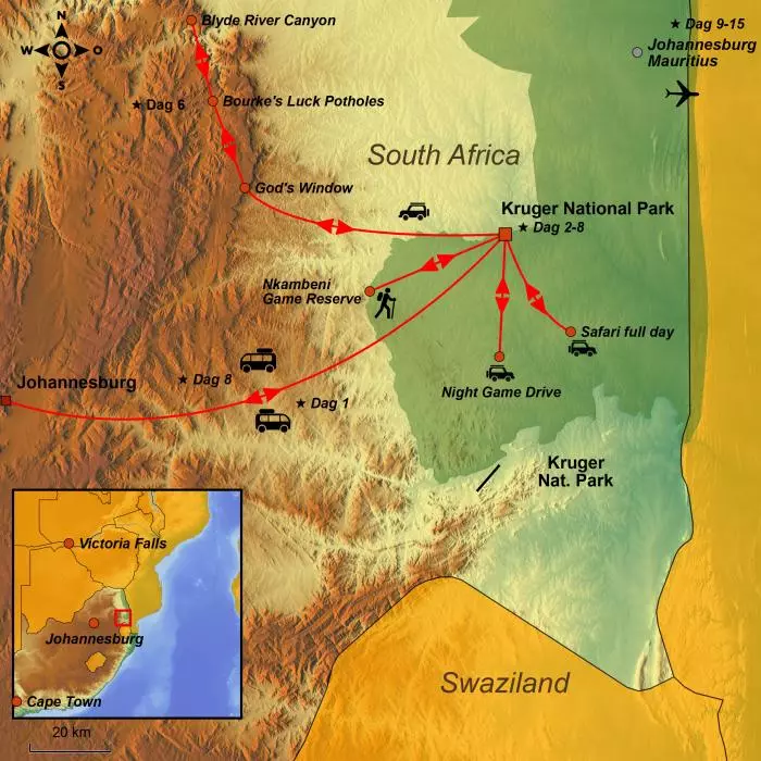 Du oplever Sydafrikas højeste og længste bjergkæde Drakensbjergene, hvor der er en spektakulær udsigt over et af turens højdepunkter Blyde River Canyon, der er verdens tredje største kløft. Du oplever også udsigtspunkterne God’s Window og Bourke’s Luck Potholes, hvor floderne Blyde og Treur har eroderet dybe, cylindriske formationer i klipperne.