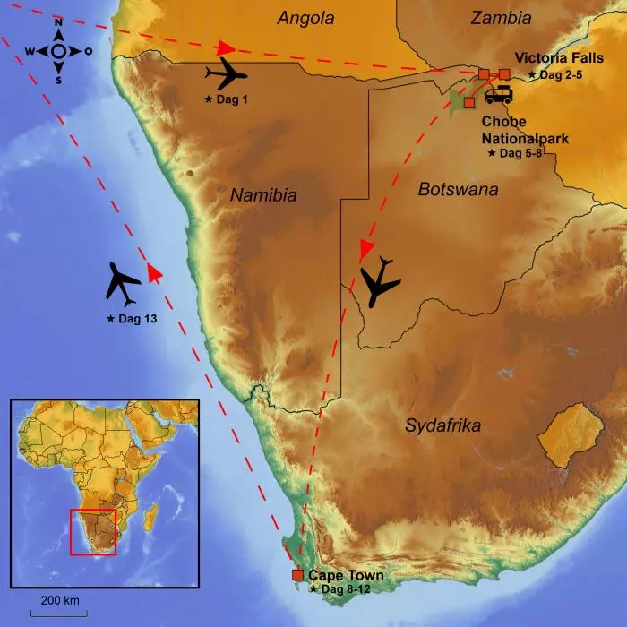 Denne rejse kombinerer tre af de allerstørste højdepunkter i det sydlige Afrika; de mægtige Victoria-vandfald på grænsen mellem Zambia og Zimbabwe, safari i Botswanas fantastiske Chobe National Park og levende, smukke Cape Town i Sydafrika. Vand, safari og storby i én og samme rejse.