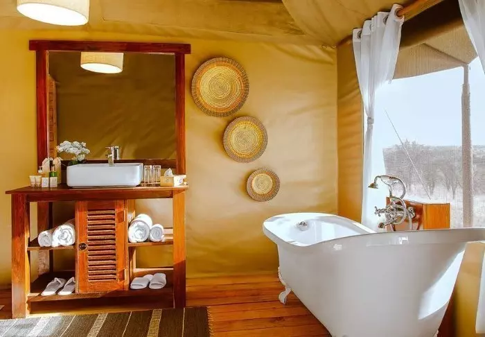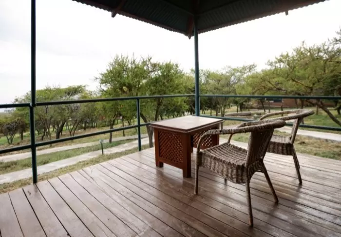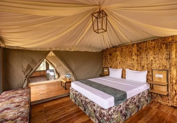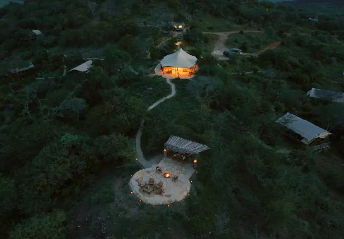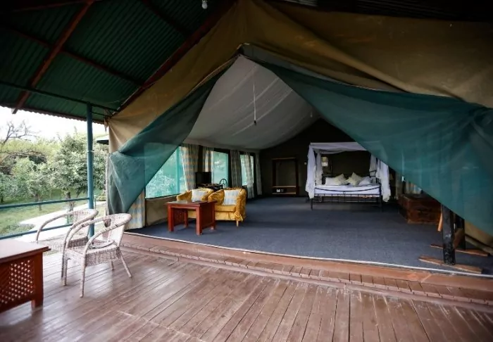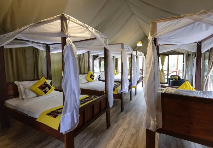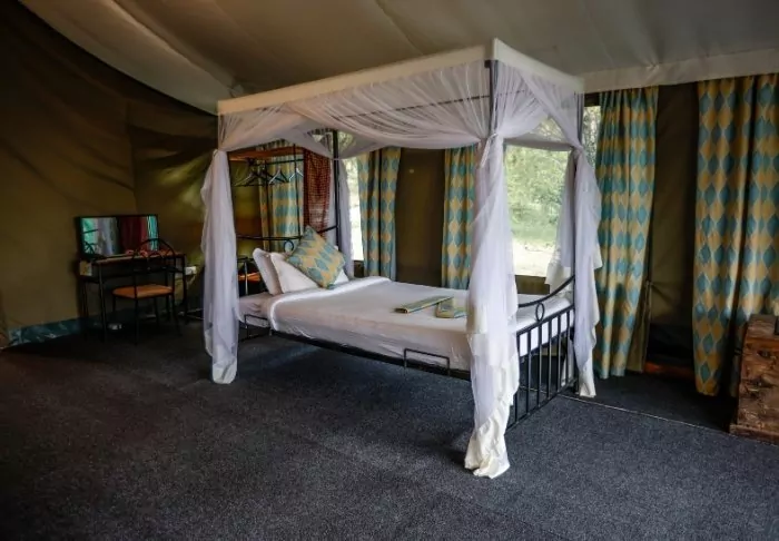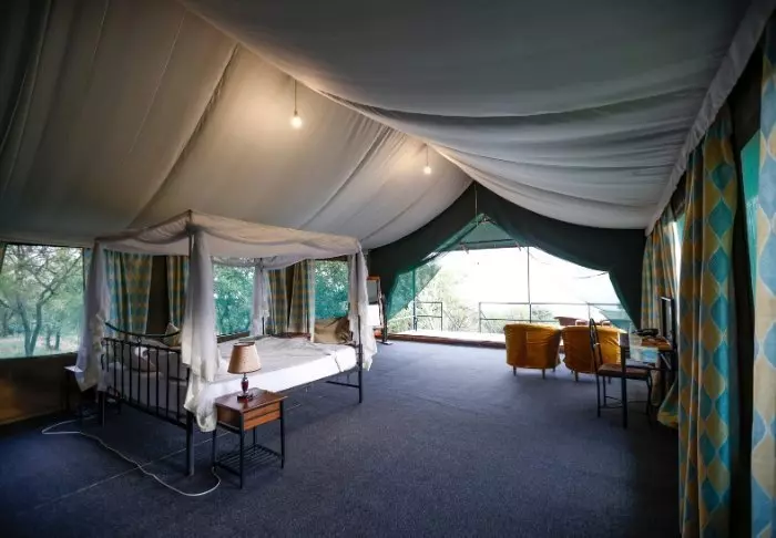 Lodgen består af 23 telte, som retteligt er en klon mellem telte og hytter. Her er faste gulve og rigtige badeværelser – mens dele af ”værelsets” øvrige vægge består af kanvas. Alle værelser har egen veranda med udsigt over området, og mellem teltene er der stier og grønne områder, så du altid har følelsen af rigeligt med plads.