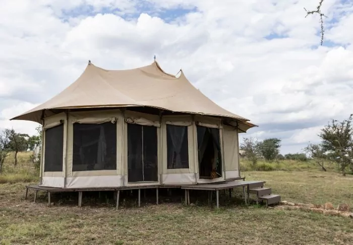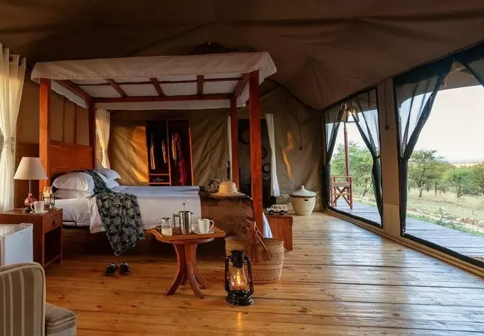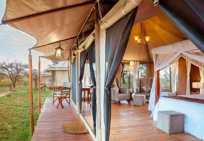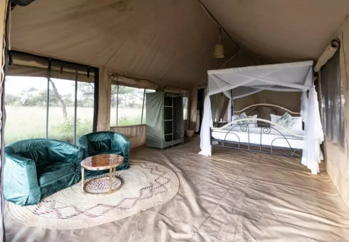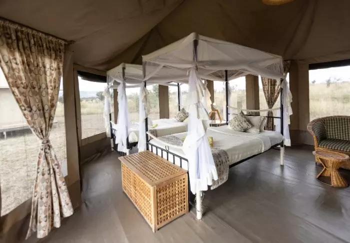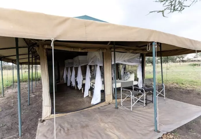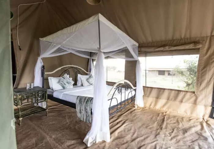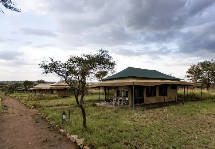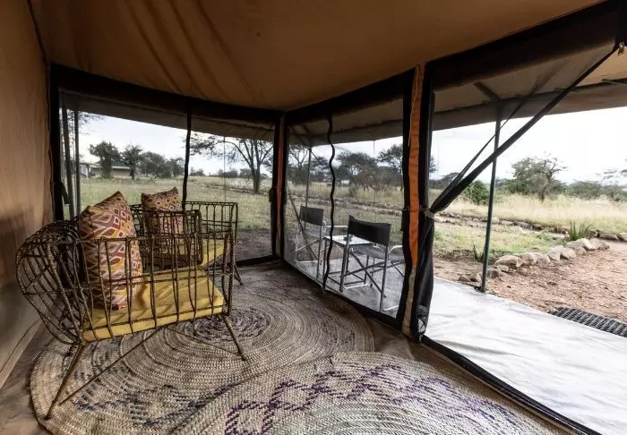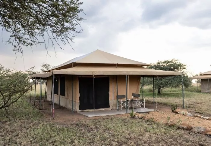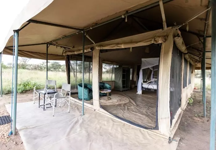 Teltene er store og har masser af plads og luft omkring de to kingsize senge. Fra opholdsrummet ledes du direkte ud på en stor, gennemgående veranda, hvorfra du har den mest fantastiske udsigt over Serengeti Plains. Alle teltene har eget badeværelse med toilet og bruser. Der er også et karbad, hvor du kan ligge og dase med direkte udsigt over nationalparken. Ligeledes er der privat udendørs bruser, som også byder på fantastisk udsigt over Serengeti Plains.