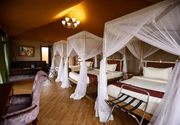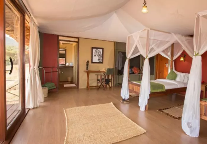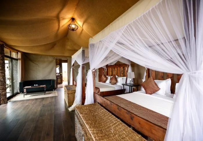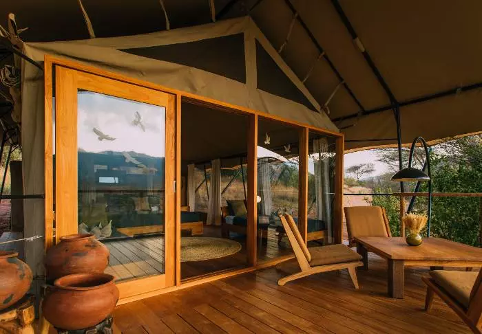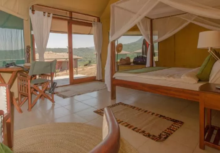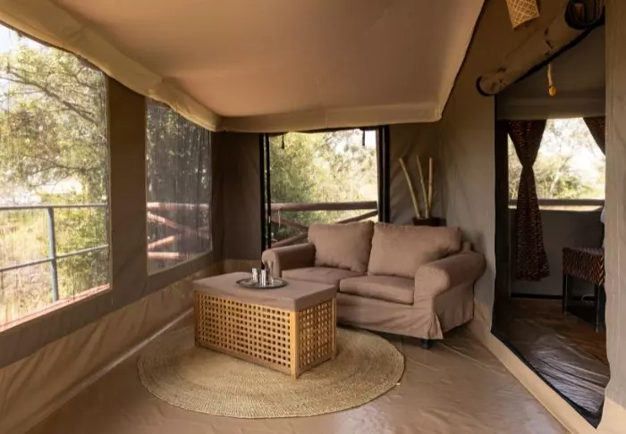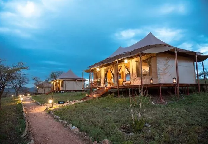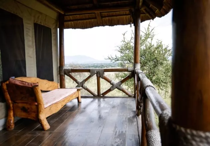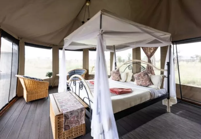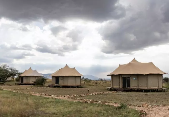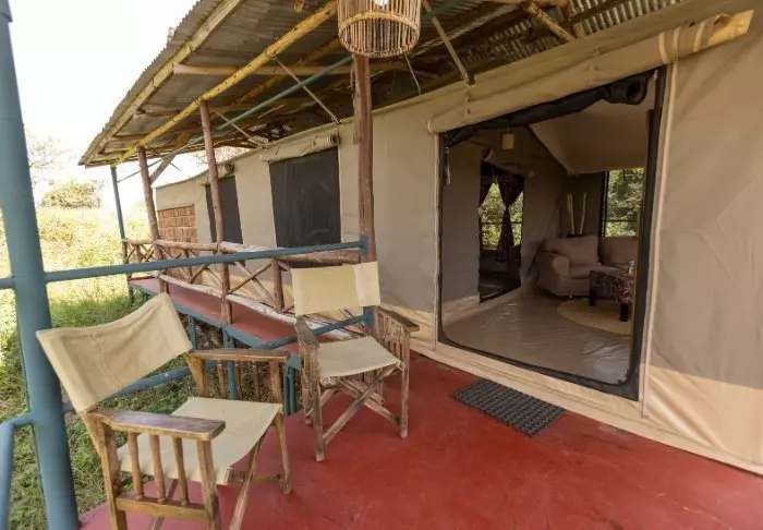 Teltene er store og har masser af plads og luft omkring de to kingsize senge. Fra opholdsrummet ledes du direkte ud på en stor, gennemgående veranda, hvorfra du har den mest fantastiske udsigt over Serengeti Plains. Alle teltene har eget badeværelse med toilet og bruser. Der er også et karbad, hvor du kan ligge og dase med direkte udsigt over nationalparken. Ligeledes er der privat udendørs bruser, som også byder på fantastisk udsigt over Serengeti Plains.