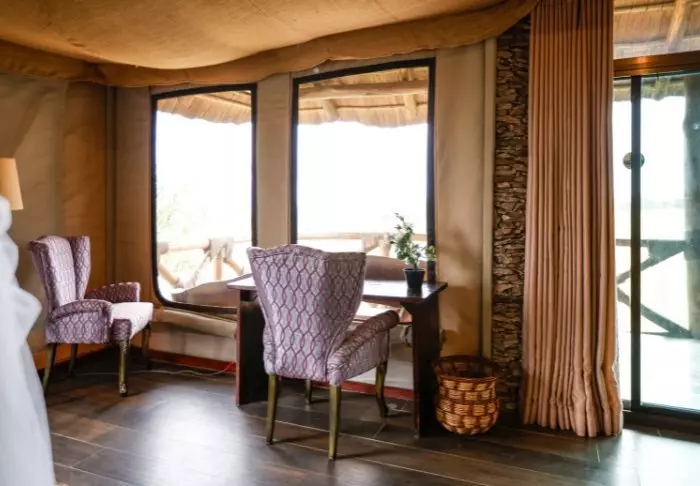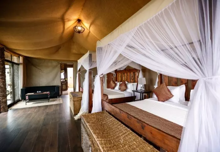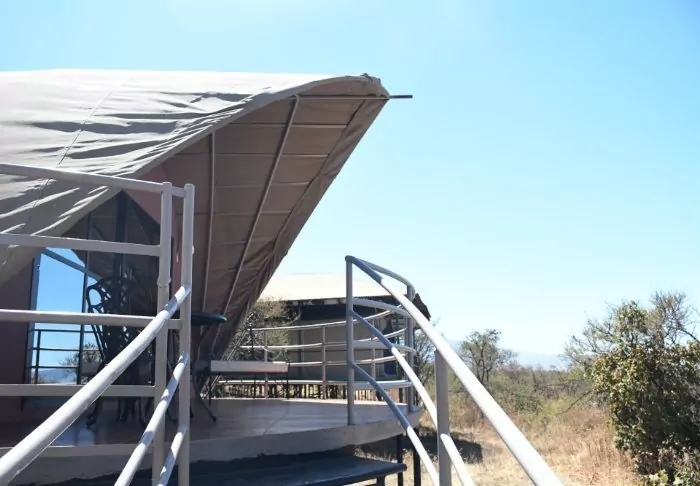 Lodgen består af 20 individuelle luksustelte, som er bygget i en raffineret kombination af kanvas og sten. Siderne består af kanvas, så du får den ægte safaristemning med lydene og duftene fra naturen udenfor, her er stråtag, og dele af væggene er bygget i sten, så det mere minder om værelser end om telte. Luksusteltene er bygget på stenpiller og svæver nærmest over jorden, hvilket både giver luftgennemstrømning og en enestående udsigt.