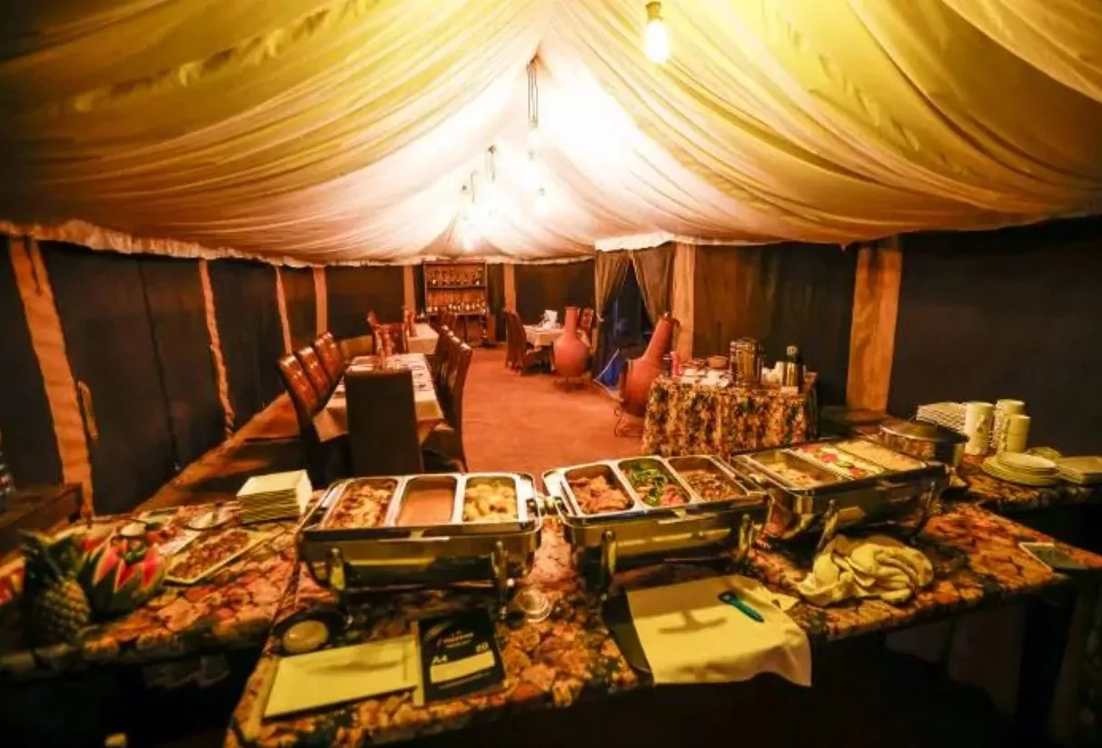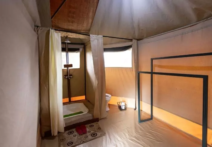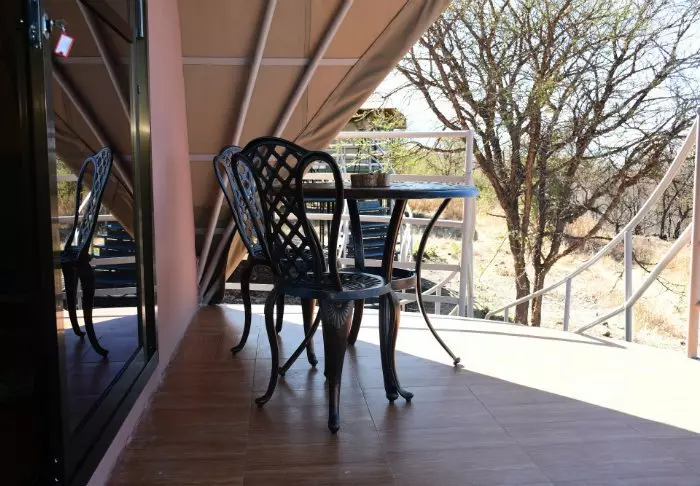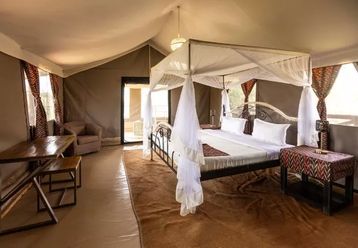 Teltlejren består af 7 luksustelte, som alle ligger på deres egen platform med balkon, hvorfra du har den skønneste udsigt til Dindira-sletten under dig. Teltene er store og rummelige og særdeles velindrettede. De har eget badeværelse – som dog bedst egner sig til, at man rejser sammen som par – og virkelig behagelige senge.