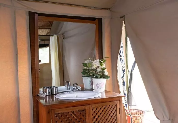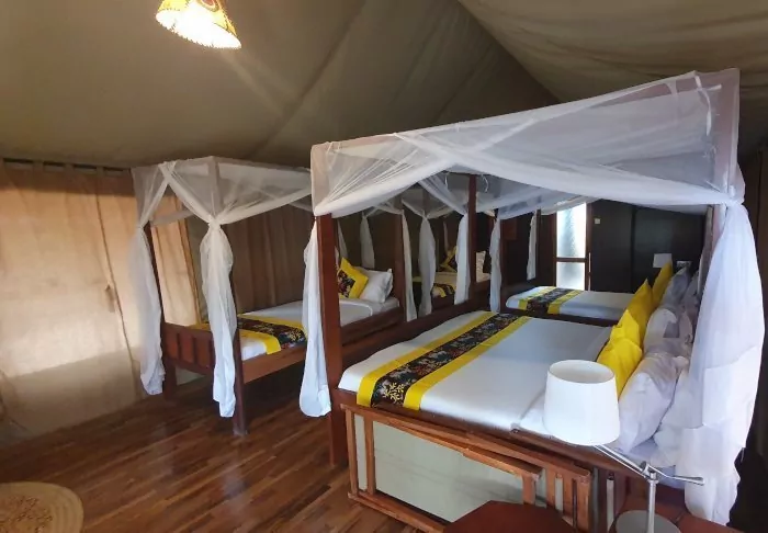 Her er 24 telte med plads til 2 eller 3 personer i hvert telt. Teltene er store, og har alle bruser og toilet, skrivebord og store senge med myggenet. Hvert telt har desuden en lille ”terrasse” udenfor med havestole, hvor du kan slappe af og nyde de fantastiske omgivelser. Endvidere er der et stort fællestelt, som bliver brugt som spisetelt.