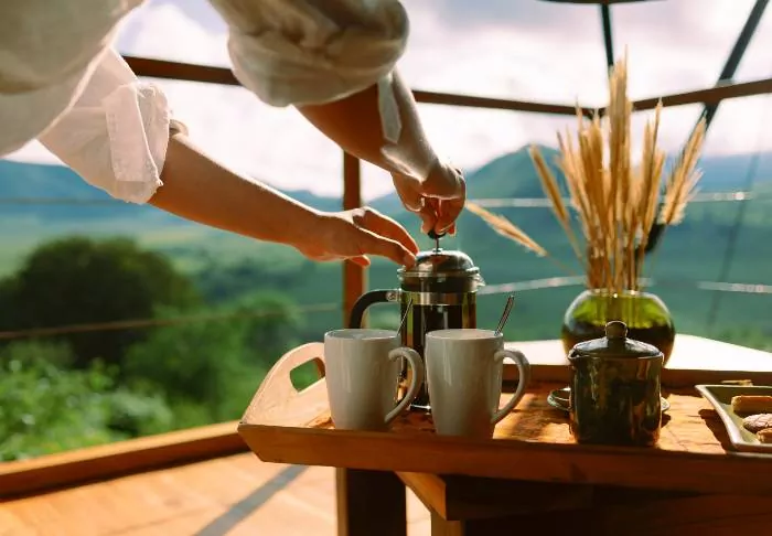 Om morgenen får du serveret friskbrygget kaffe på balkonen, så du i ro og mag kan nyde solopgangen, inden du sætter kursen mod restauranten, hvor et overdådigt morgenmåltid serveres.