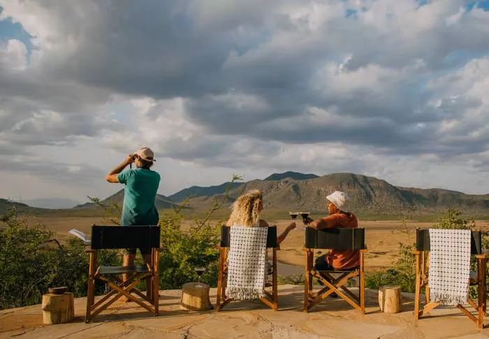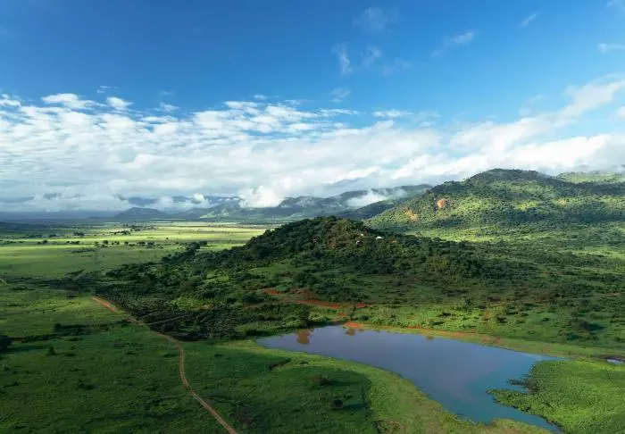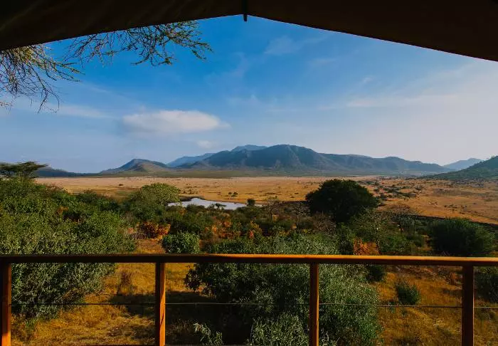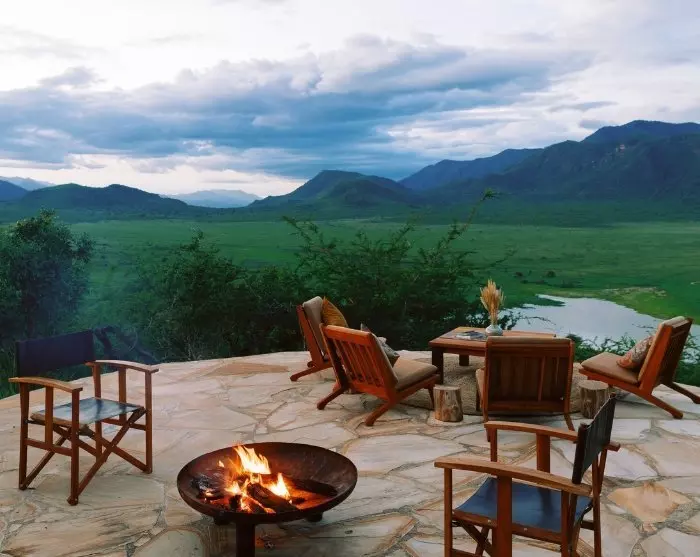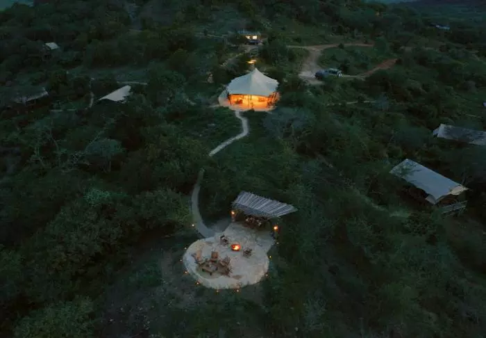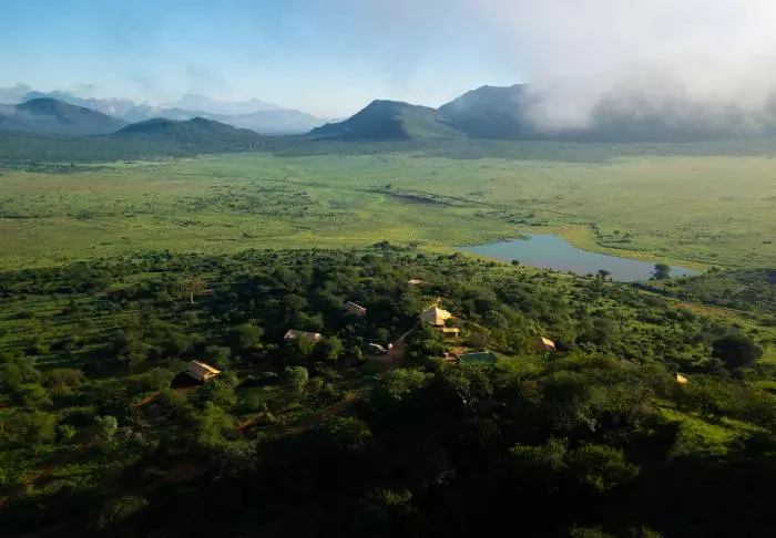På en bakketop med den mest vidunderlige udsigt over Mkomazi Nationalparks eneste permanente vandhul ligger Mkomazi Wilderness Retreat.