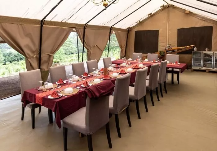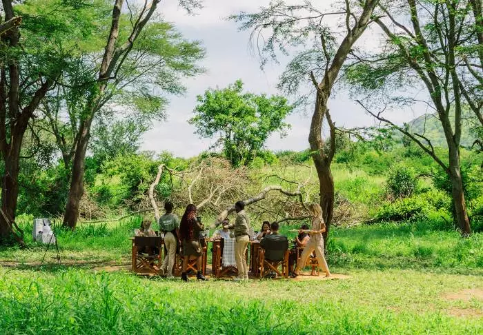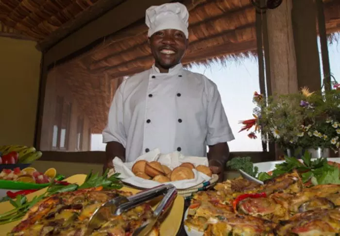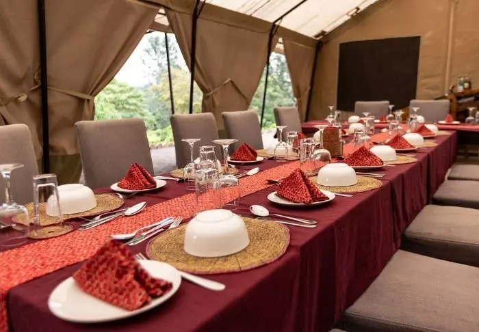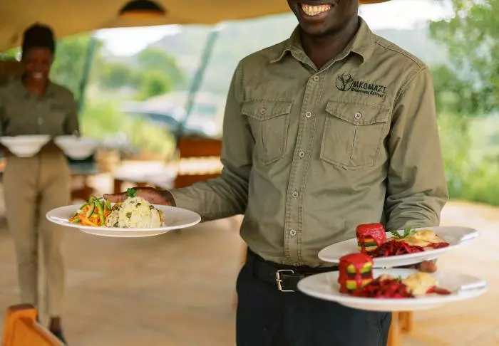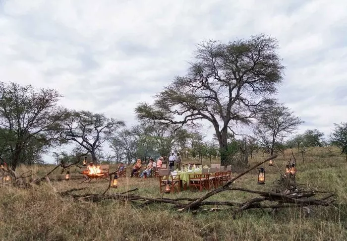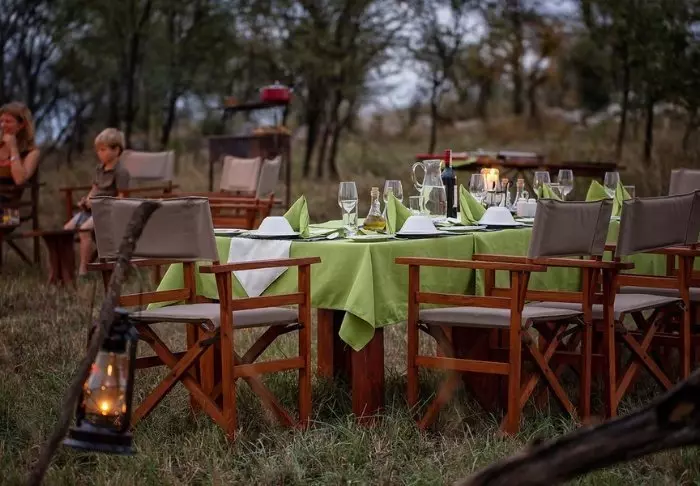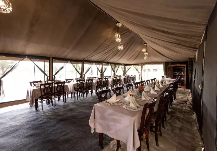 Måltiderne indtages typisk i messeteltet – hvis da ikke der dækkes op i bushen udenfor, hvor du kan nyde den afrikanske aftenhimmel ved det hyggelige lejrbål.