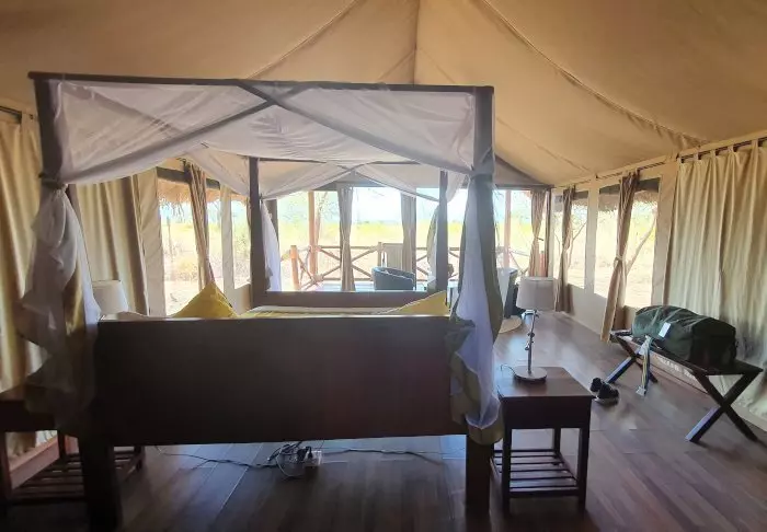 De 24 telte på Simba Lodge er alle store og rummelige og meget hyggeligt indrettet. Badeværelserne er store, og her er varmt vand – både i den indendørs og udendørs bruser. Der er strøm i teltene, men da det er solcelle-strøm, henstilles der til, at man kun lader sin mobil og sit kamera op i teltet. Større ting skal forbi receptionen for at blive ladet op.