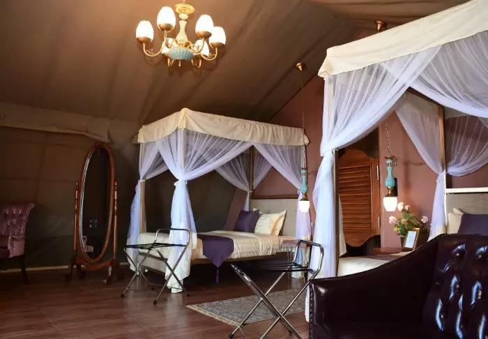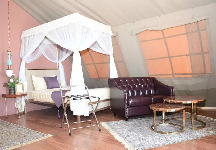 Alle teltene er flot indrettet med himmelsenge med myggenet, skrivebord, sofa, lysekrone og i det hele taget med rigtig god plads.