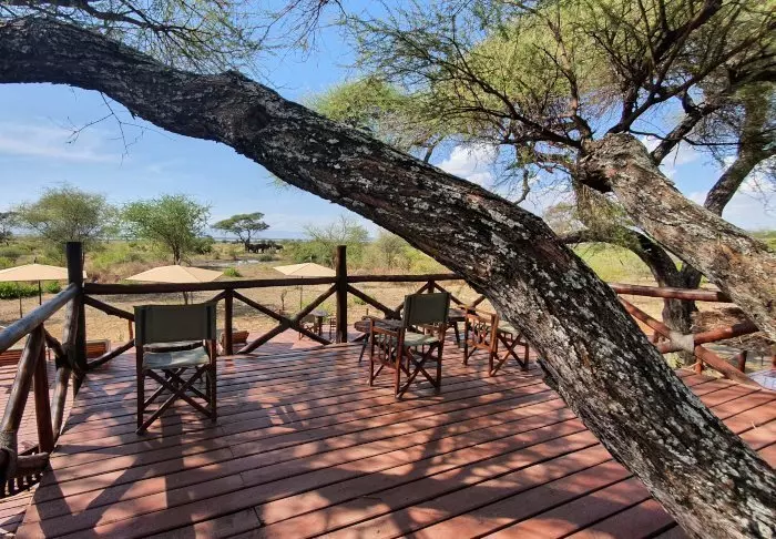 Udsigten fra det hævede dæk på Tarangire Simba Lodge er fænomenal. Det er lige før, du ikke behøver køre på safari. Det permanente vandhul tiltrækker dyr dagen igennem – og det hele foregår lige foran dig – på første parket.
