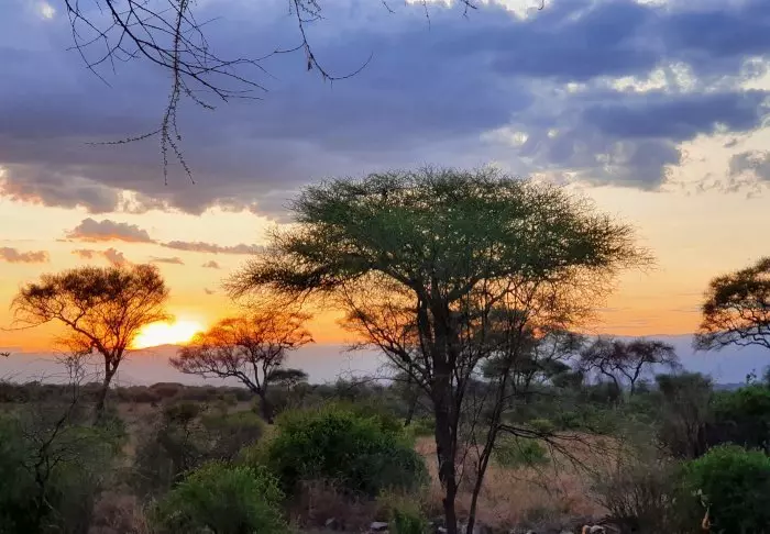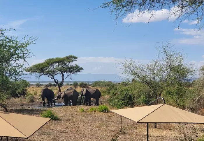 Varme-“låget”, som hele dagen har ligget over Tarangire som en tung dyne, letter langsomt. Skyggerne bliver længere, og selv vinden falder til ro. Poolen har lige kølet dig ned efter dagens safari, og nu kommer tjeneren med en kold øl, mens du lægger dig til rette på solvognen. Du holder øje med bushbukkene, der nærmere sig vandhullet nogle hundrede meter fra poolen. Det er blevet ledig, efter elefanterne har fået deres brusebad.