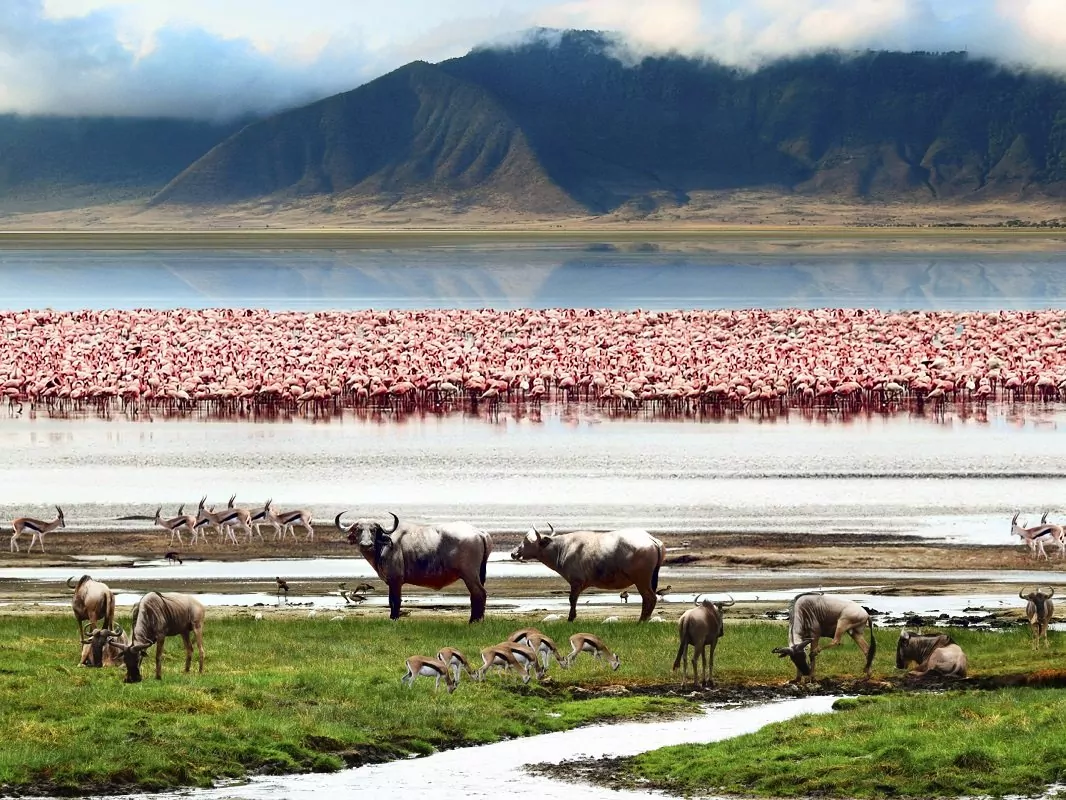 Fra toppen af kraterkanten snor vejen sig 600 meter ned på indersiden af det udslukte vulkankrater til den 260 km² store kraterbund. I det frodige krater er der både savanne, sumpe, søer, små floder, akacieskov og en saltvandssø. Krateret er hjemsted for 25.000 – 30.000 dyr. Oplevelsen på kraterbunden bliver af mange sammenlignet med at ”køre en tur i Jurassic Park”, fordi der overalt er dyr. Der er flere løvefamilier på det forholdsvis lille område, store bøffelhjorde, flamingoer, ja selv det sorte næsehorn har fundet vej ned i krateret. Det eneste dyr, du ikke kommer til at opleve her er giraffen, som aldrig har bevæget sig fra Serengeti til Ngorongoro krateret.