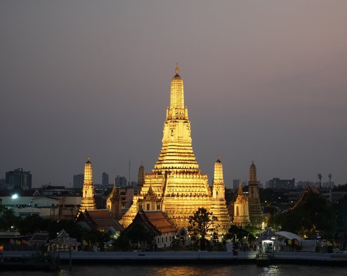 Aftenen slutter på en afslappet rooftop bar, der ligger ved Chao Phraya-floden med udsigt til det oplyste tempel Wat Arun. Udsigten bliver ikke meget bedre!