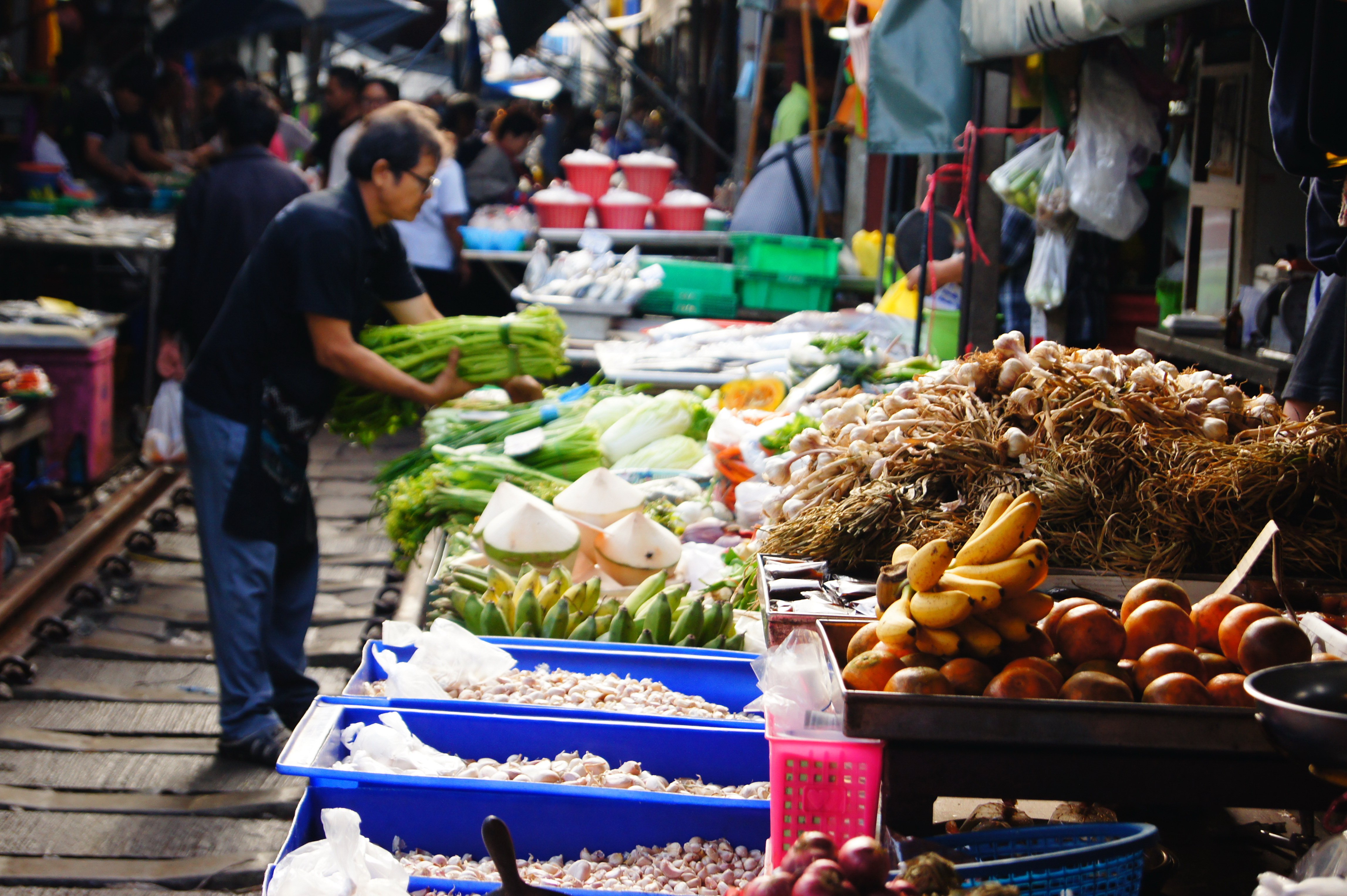 Efter godt og vel 1 times kørsel ankommer du til Maeklong. Her vil du opleve det livlige markedsliv, hvor der sælges en bred vifte af produkter bl.a. frisk frugt, grøntsager, krydderier, kød, fisk og souvenirs. Det mest fascinerende ved markedet er, at det delvist ligger på jernbanesporene. Når toget langsomt nærmer sig, bliver du dirigeret ind bag de røde linjer, så du står i sikker afstand fra toget. Sælgerne har udviklet en effektiv metode til at folde deres marked sammen i en hurtig og koordineret indsats for at give plads til toget – det er ret sjovt at overvære. Hvis tiden tillader det, går du ned til selve Maeklong Station, hvor toget holder stille indtil, det skal samme vej tilbage. Få skridt fra togstationen og væk fra turiststrømmen, finder du små hyggelige boder, hvor du bl.a. kan købe en iskaffe, thai te eller den thailandske dessert ”khanom krok”.